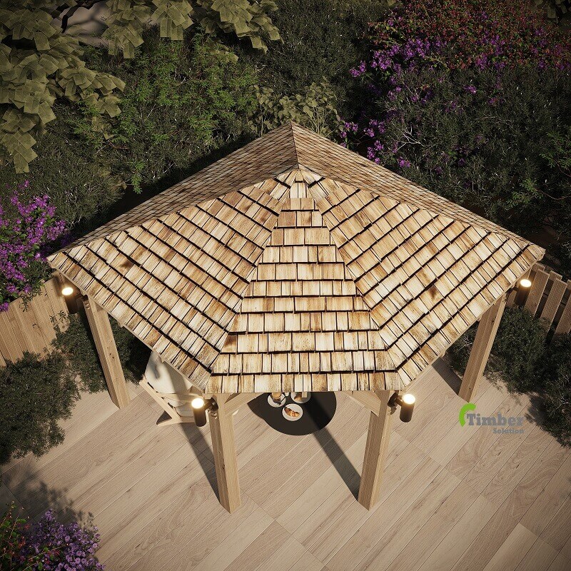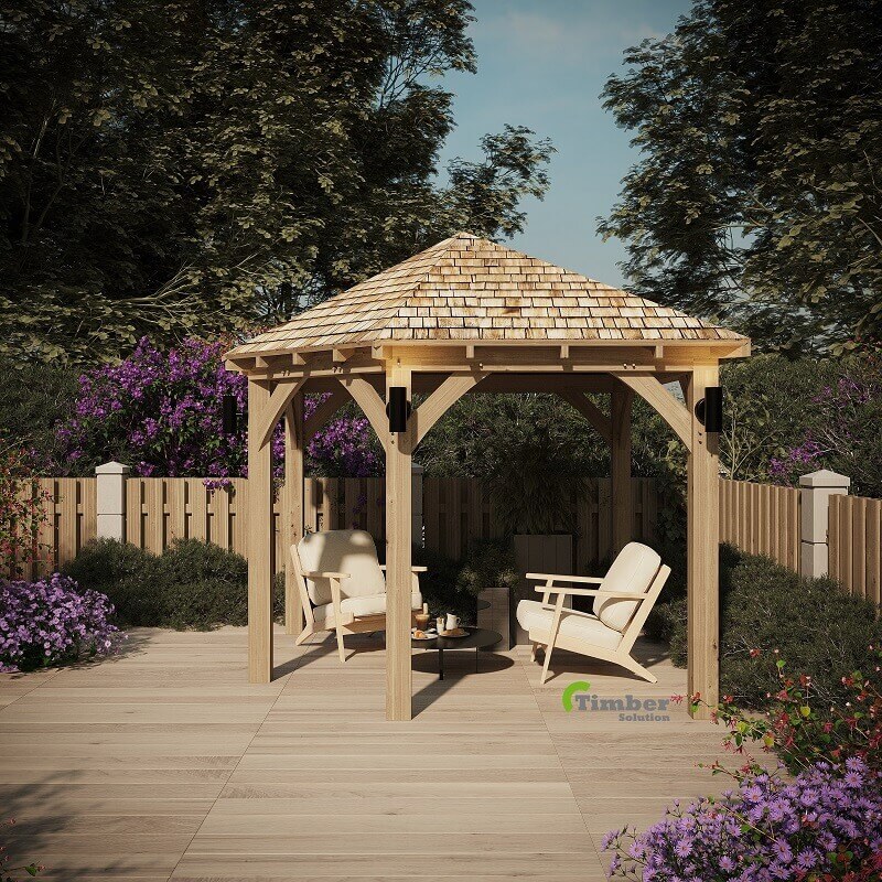 Moreover, many corner oak gazebos feature a natural cedar shingle roof. This type of roof not only provides excellent weather protection, but it also adds a classic and elegant appearance. As a result, the gazebo blends naturally with most garden designs.