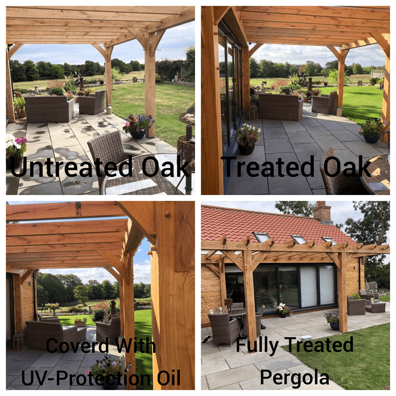 On the image below, you can see a solid oak pergola before and after applying protective oil.