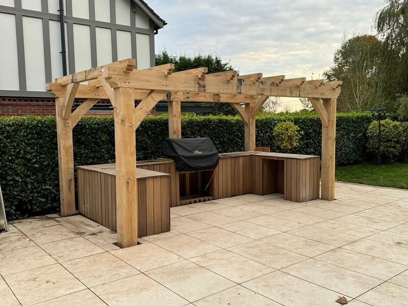 A wide-span pergola achieves a minimalist look while retaining oak’s natural warmth. It complements both contemporary and traditional gardens beautifully.