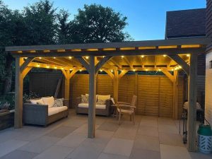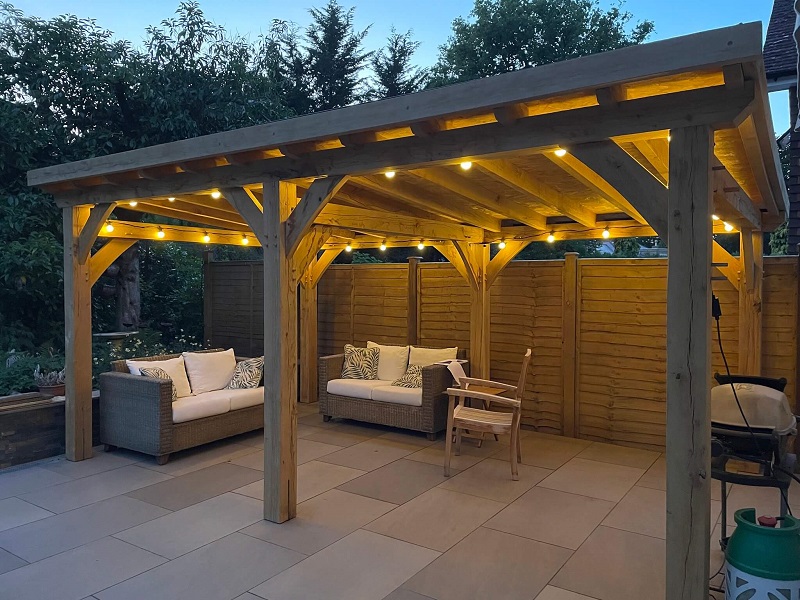 When paired with oak side panels, it transforms into a comfortable year-round retreat — perfect for outdoor dining, hot tubs, or garden seating areas.