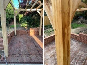 The photos show how tannins from the oak structure have leached out and stained the new paving. Rainwater washed tannins from the timber onto the surface, leaving dark marks on the paving and streaks on the wood. The client hadn’t checked our cover list with recommendations, where we advised covering the whole area with foil for a few weeks to prevent this issue while the oak settled.