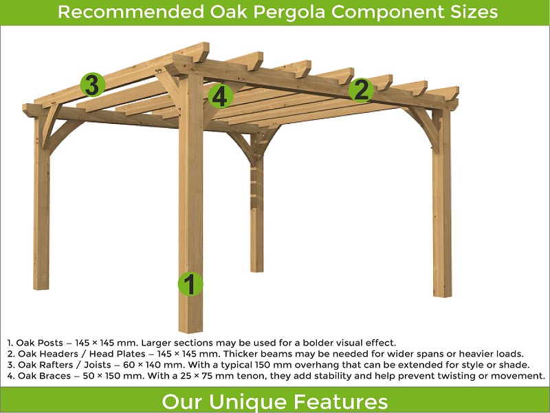 Natural movement is part of oak’s character. By using the right dimensions, solid joinery, and professional fixing methods, you can ensure your oak pergola remains both structurally secure and visually stunning for years to come.