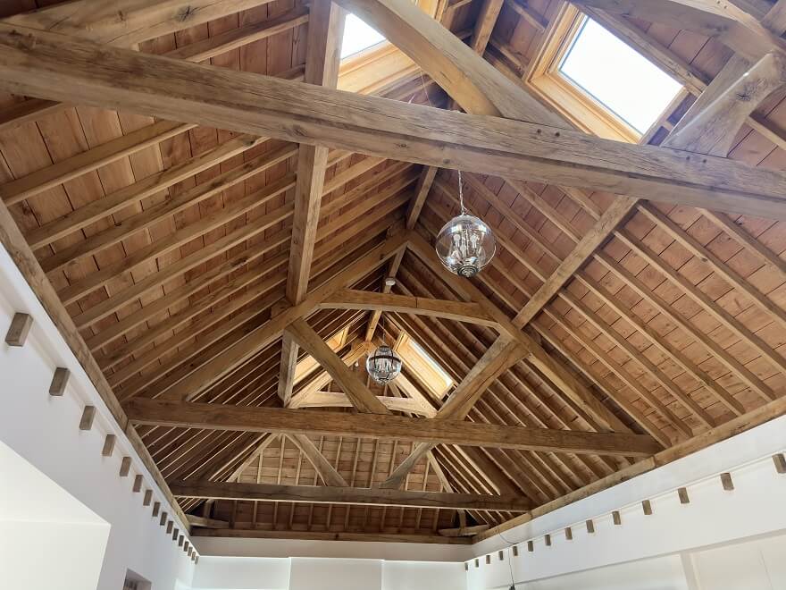 A Green Oak Queen Post Truss is a timber frame structure made from freshly cut green oak, known for its strength and durability. This design features two vertical queen posts supporting a horizontal beam, effectively distributing weight and providing stability. Spans typically range from 4 to 8 meters, with the potential to extend up to 12 meters. Commonly used in barns, galleries, and residential homes, this truss offers aesthetic appeal and flexibility in design, making it ideal for open spaces and high ceilings.